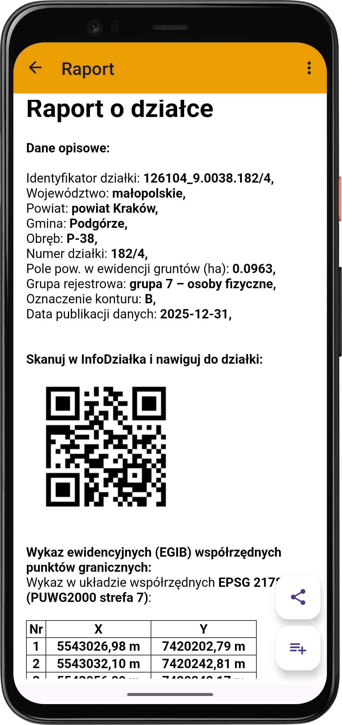Raport zawiera podstawowe informacje o wybranej działce (które zostały udostępnione przez organ prowadzący EGiB) oraz wykaz współrzędnych punktów granicznych w wybranym układzie współrzędnych.